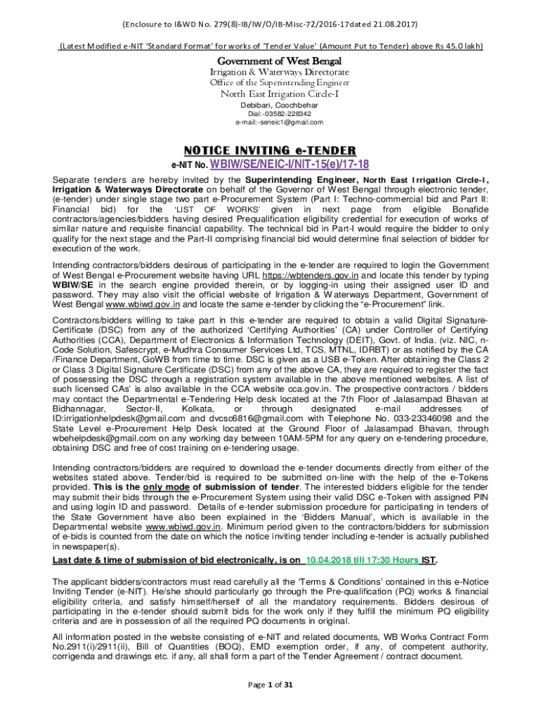 Get the free NOTICE INVITING e-TENDER e-N.I.T. No - WBIW/EE/ ... - wbiwd gov