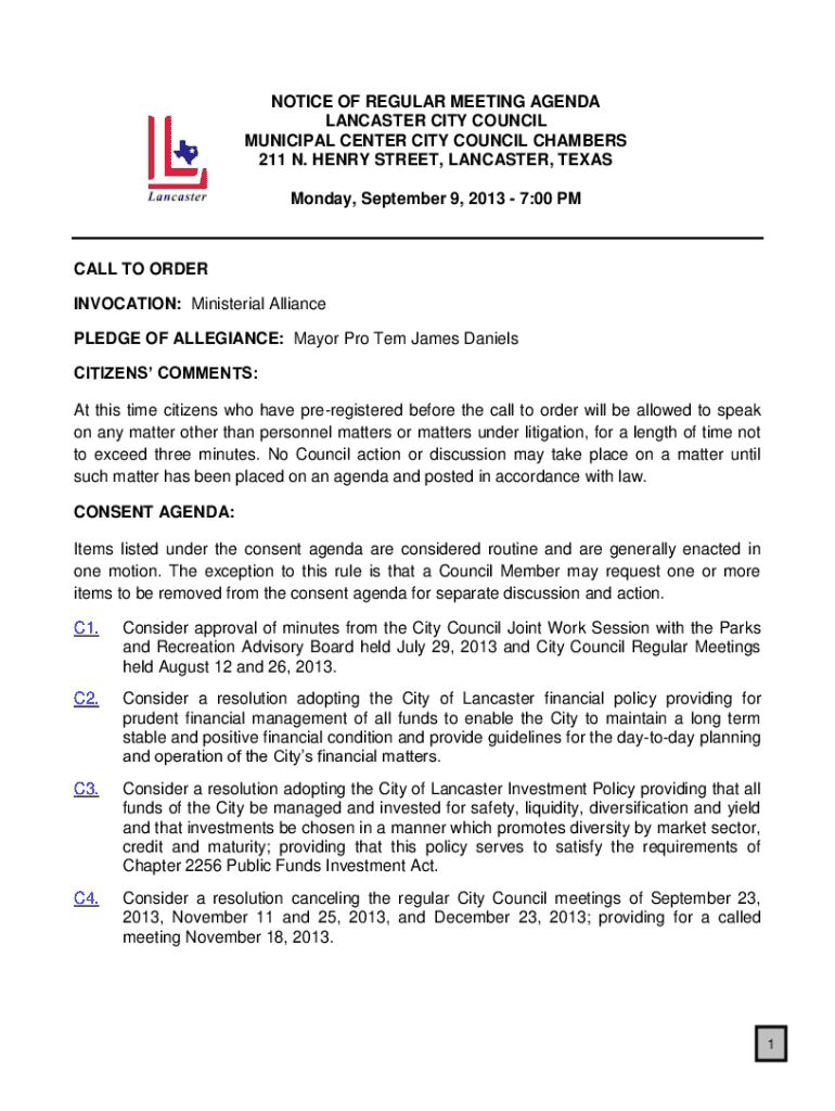 Get the free Notice of Regular Meeting Agenda