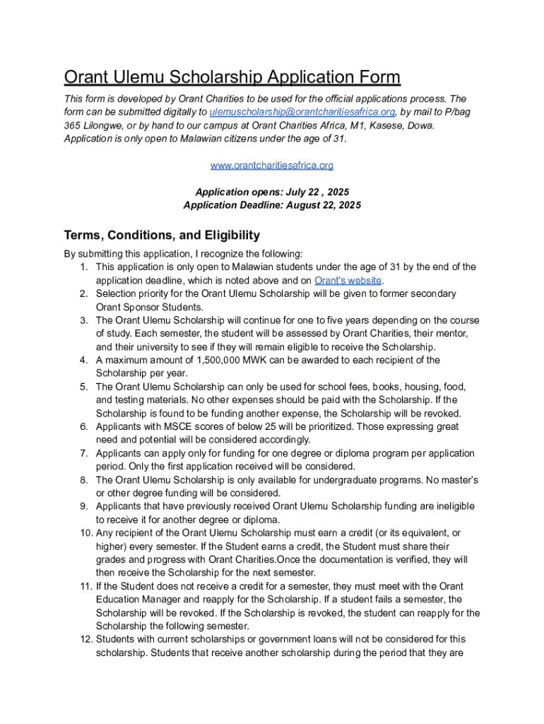 The Orant Ulemu Scholarship is an initiative aimed at empowering the youth of Malawi through education. With a mission to provide financial assistance to deserving students, this scholarship emphasizes leadership potential, academic excellence, and community involvement. By supporting students from financially disadvantaged backgrounds, the scholarship plays a pivotal role in promoting educational opportunities and fostering a brighter future for Malawi's young leaders.