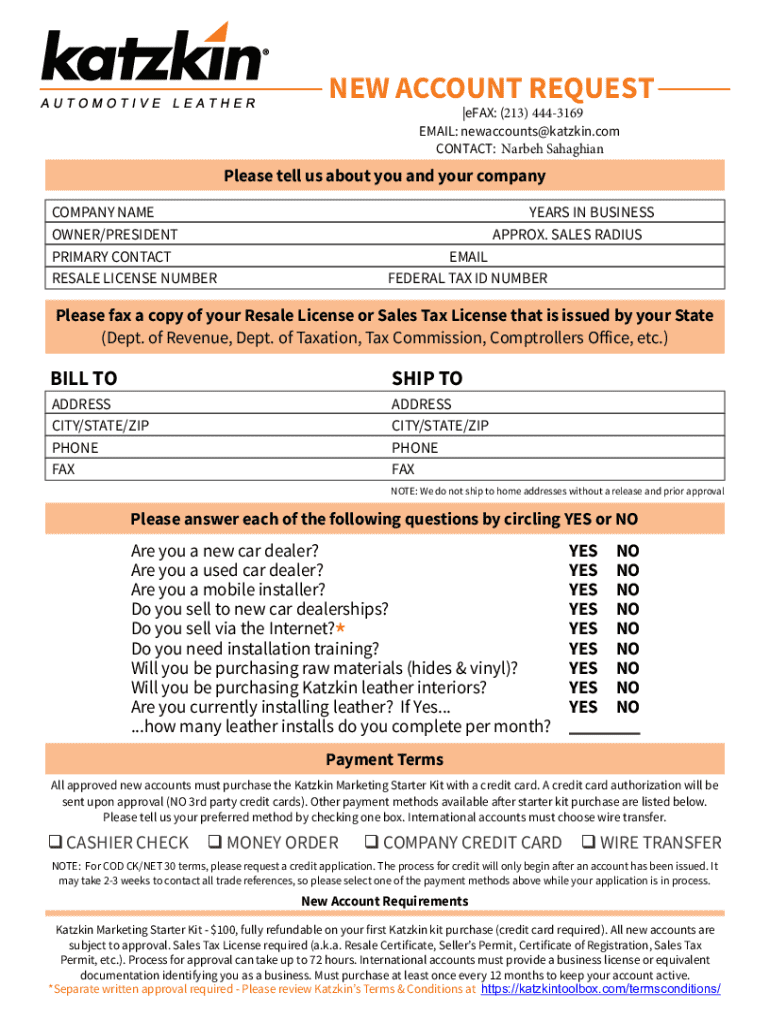 The New Account Request Form comprises several critical components essential for its completion. At the forefront, personal details including name, address, and contact information must be provided, as these details help in identifying and verifying the applicant. Additionally, identification verification is necessary; this often requires the submission of government-issued IDs or similar documentation to validate the user's identity.