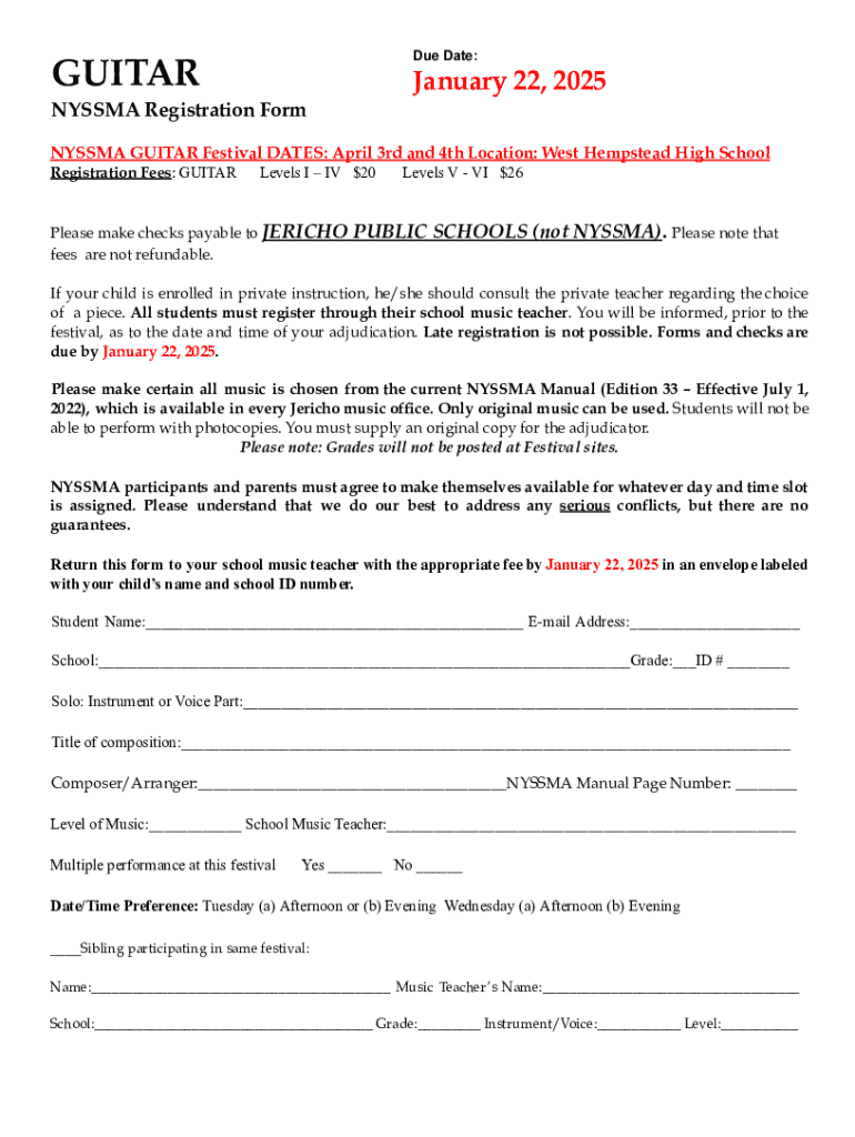 The NYSSMA Registration Form is an essential document for students aspiring to participate in the New York State School Music Association (NYSSMA) events. This form serves as a gateway for students to showcase their musical talents in front of adjudicators, enabling them to receive valuable feedback and experience. Completing this registration is not just a formal process; it represents a commitment from students to hone their skills and take their performances to the next level.