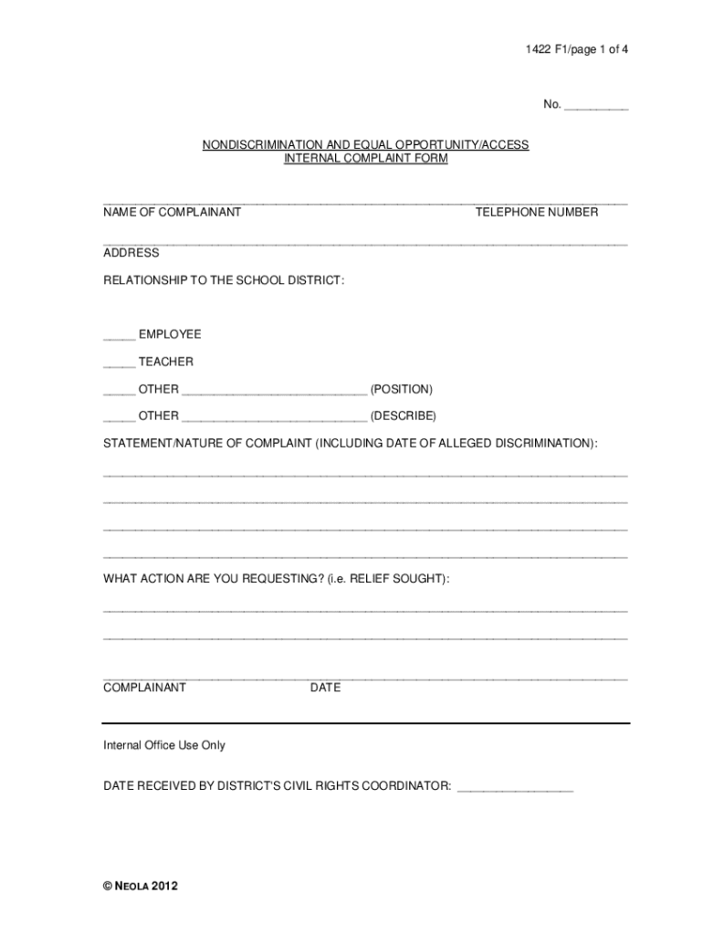 Get the free Nondiscrimination and Equal Opportunity/access Internal Complaint Form