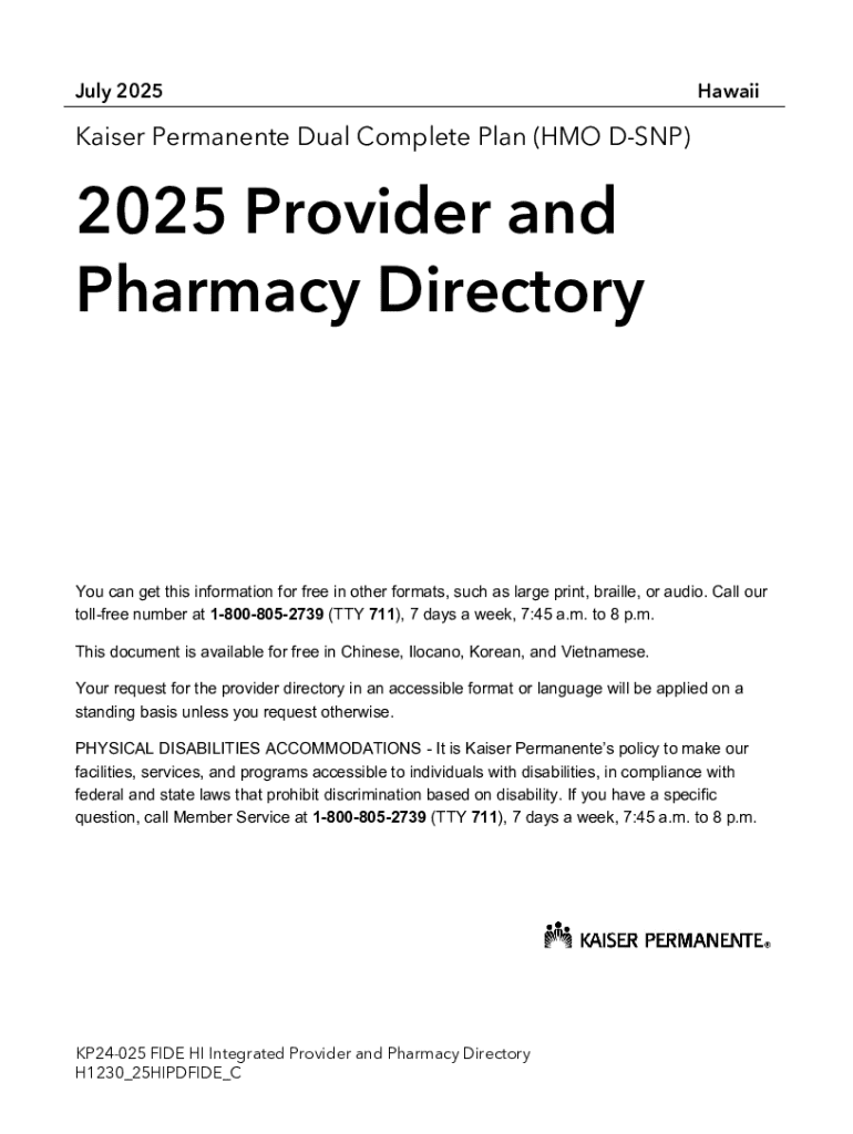 Get the free Kaiser Permanente Dual Complete Plan (hmo D-snp) 2025 Provider and Pharmacy Directory
