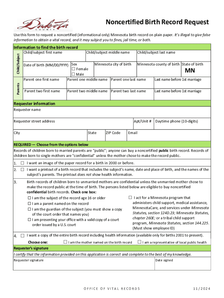 This form is used to request a noncertified (informational only) Minnesota birth record on plain paper. It outlines the necessary information and requirements for obtaining such records as well as