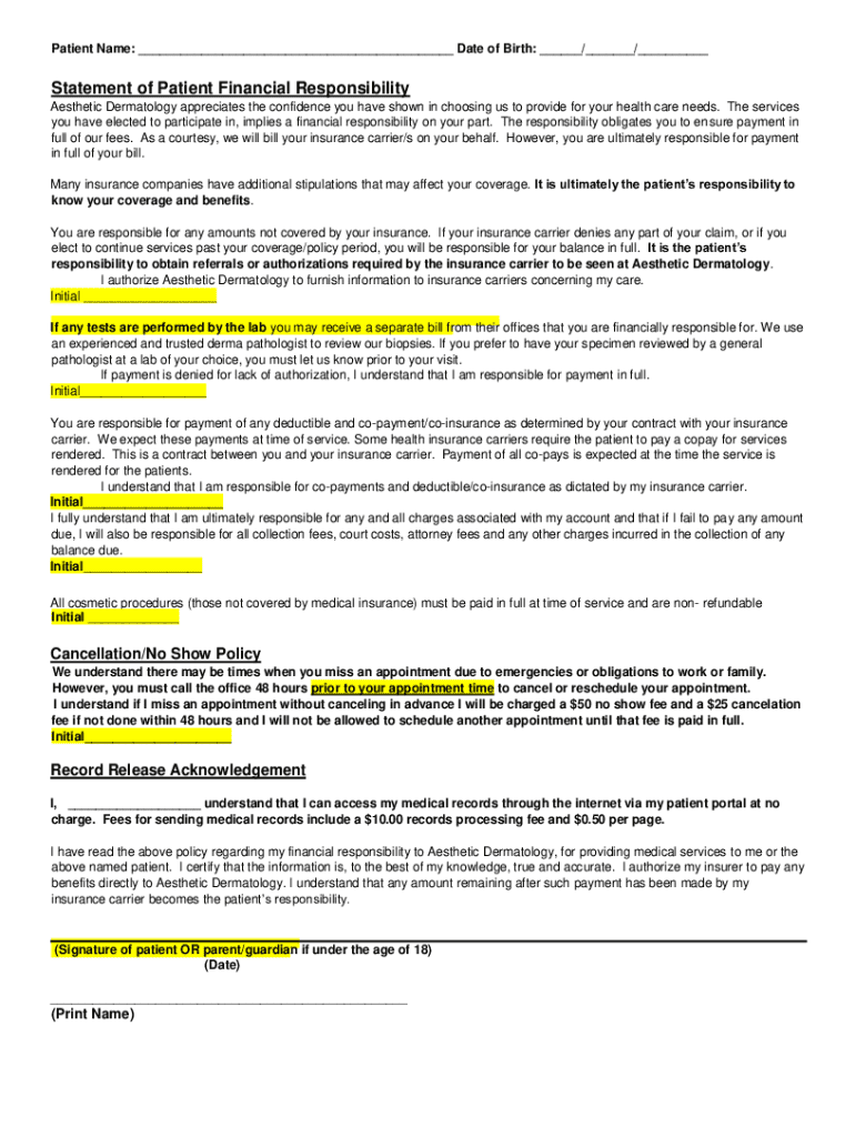 Financial responsibility is crucial in patient care as it not only promotes transparency but also ensures billing procedures are followed properly. The form typically includes key components such as patient information, insurance details, and a section for financial responsibilities that the patient agrees to accept.