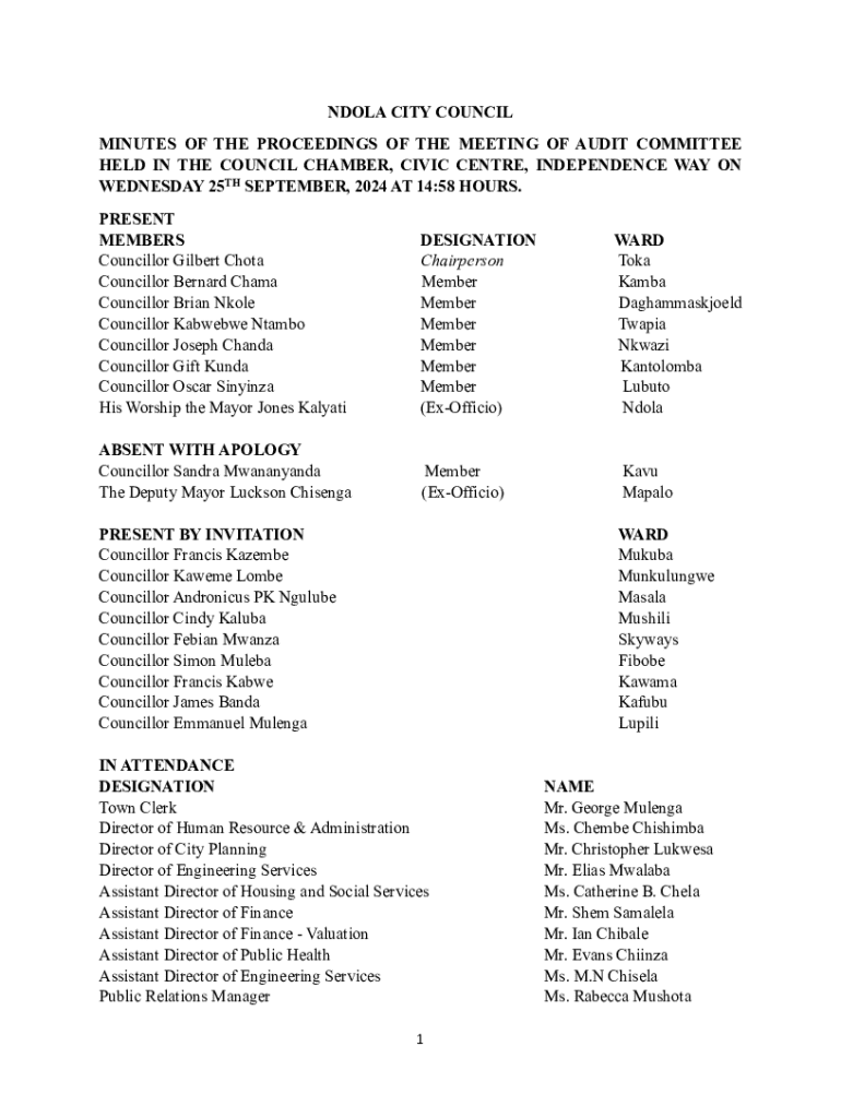 This document contains the minutes of the Ndola City Council Audit Committee meeting held on September 25, 2024, detailing attendance, discussions on financial performance, audit findings, and recommendations