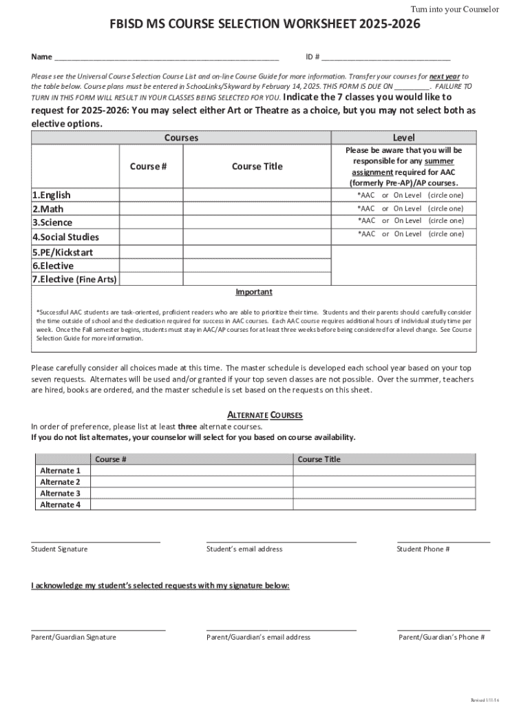 The FBISD MS course selection form serves a crucial function for middle school students, guiding their academic journey and helping them make informed decisions about their education. Understanding the purpose of course selection is foundational for students impacted by various factors like their interests, career aspirations, and educational goals. By utilizing this form, students can tailor their course load to fit their strengths and areas for growth.