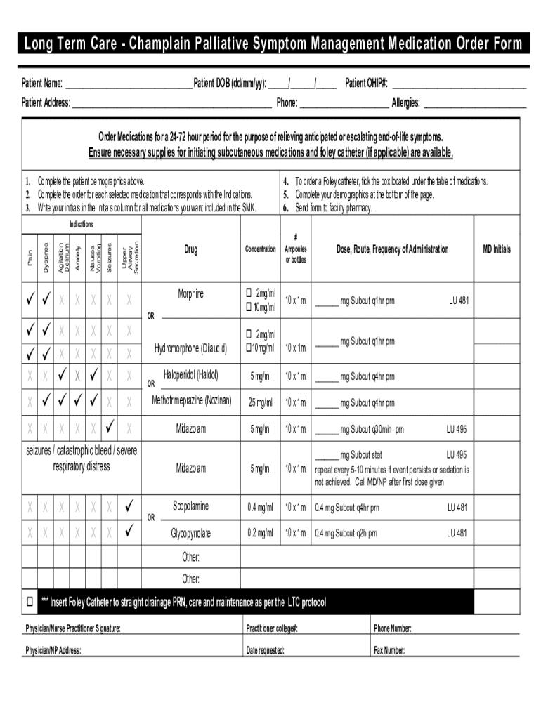 Get the free Long Term Care - Champlain Palliative Symptom Management Medication Order Form