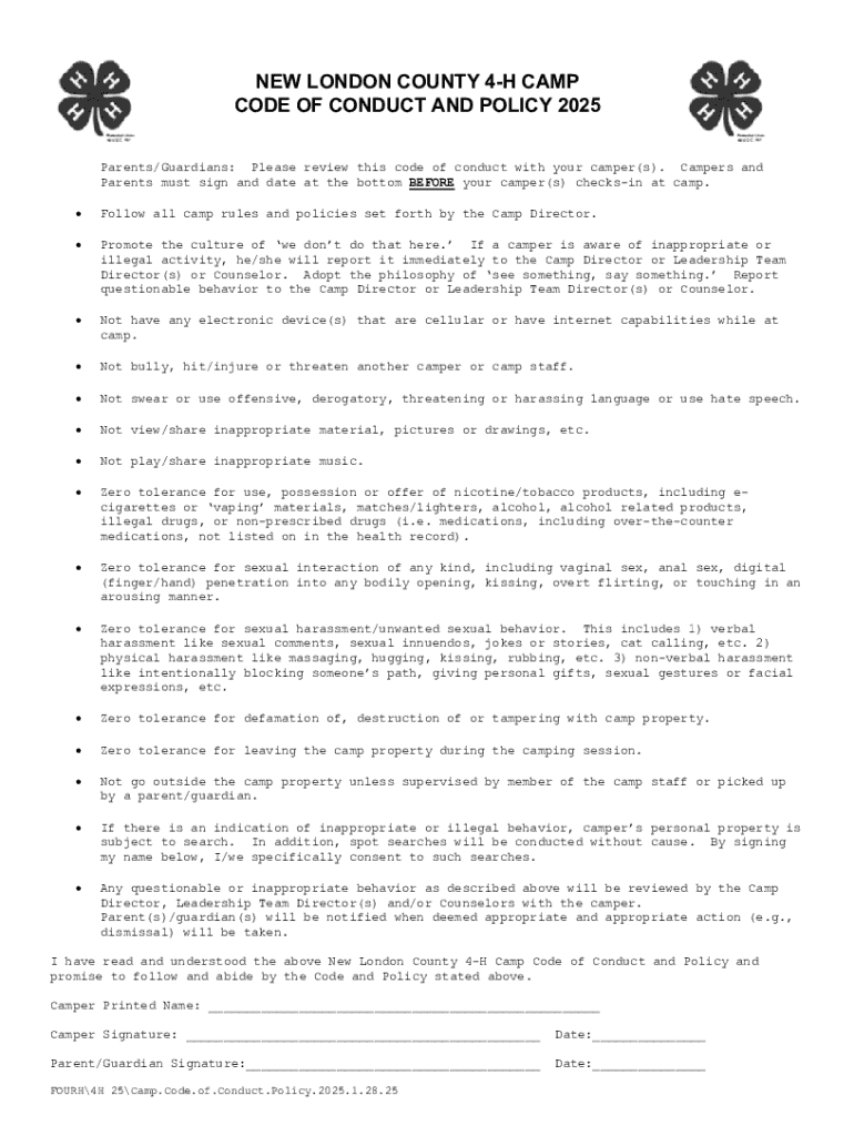 Get the free New London County 4-h Camp Code of Conduct and Policy 2025