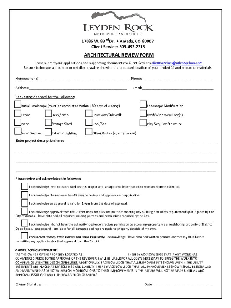 An architectural review form serves as the official document submitted to commence this evaluation process. It collects essential details about the proposed changes, allowing the review committee to assess if the project aligns with the community's guidelines. Thus, this form provides a structured way for homeowners to communicate their intentions clearly.