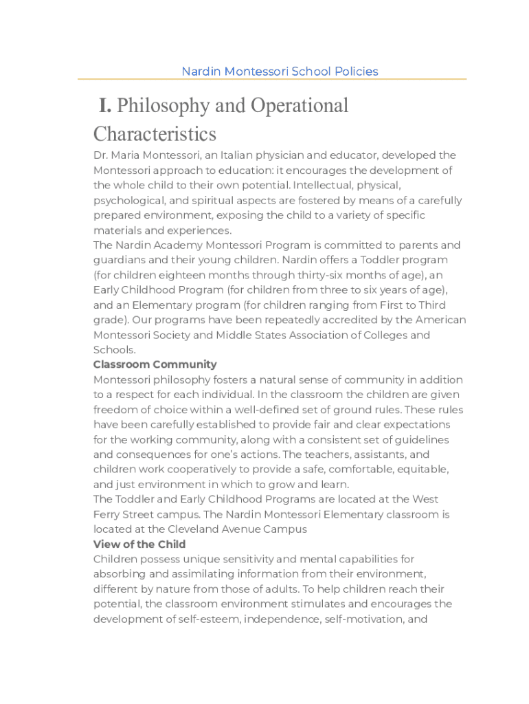 This document outlines the policies and procedures of Nardin Montessori School, detailing the educational philosophy, program structures, daily operations, and parent involvement.