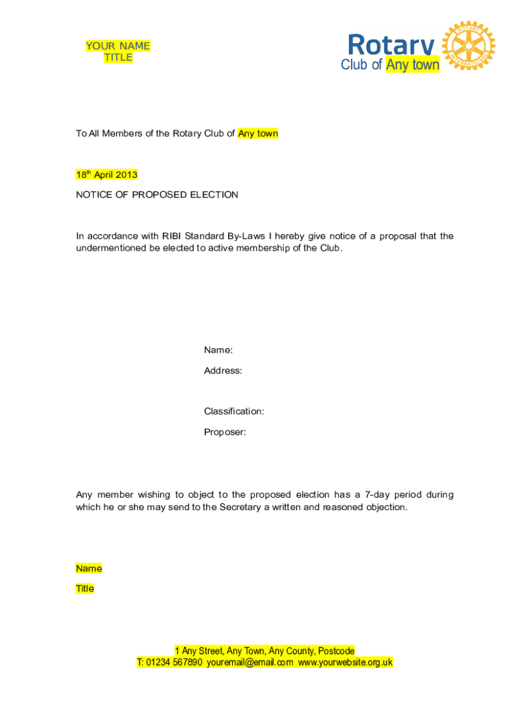 This document is a notice for members of the Rotary Club of Any Town regarding the proposal for election to active membership.