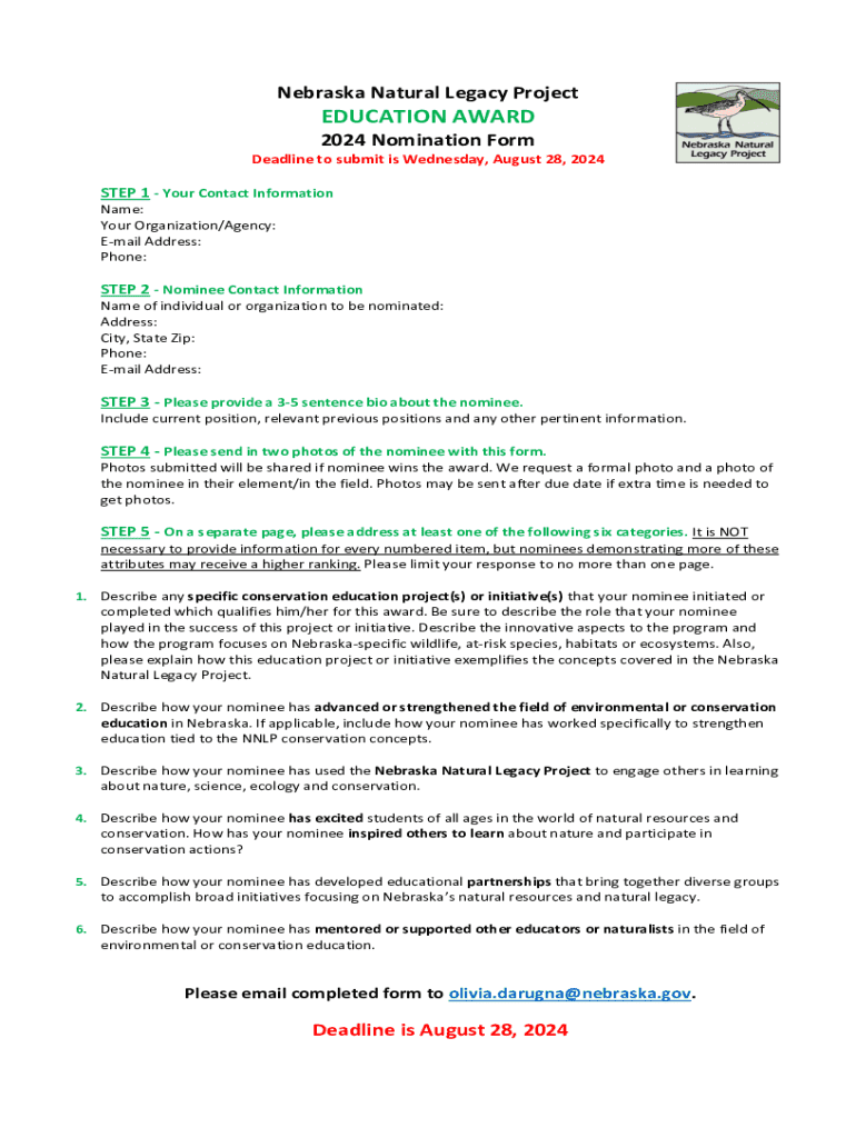 Get the free Nebraska Natural Legacy Project Education Award 2024 Nomination Form