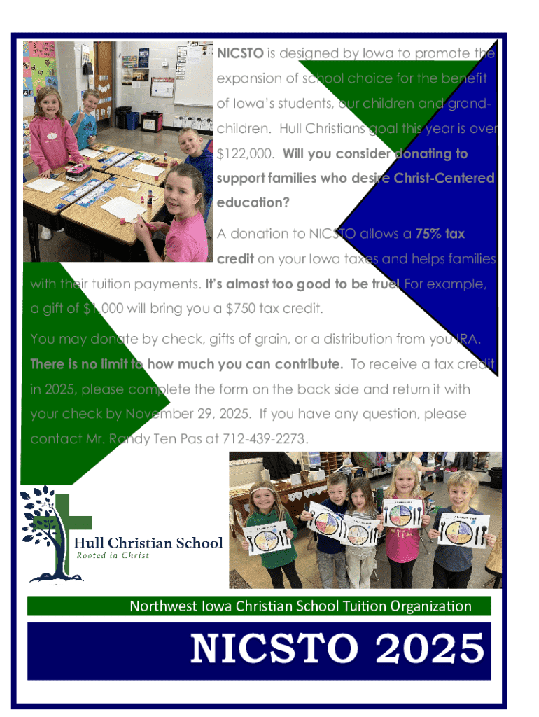 This document is a memo for a donation to the NICSTO, which provides tax credits for contributions toward Iowas Christian school tuition.