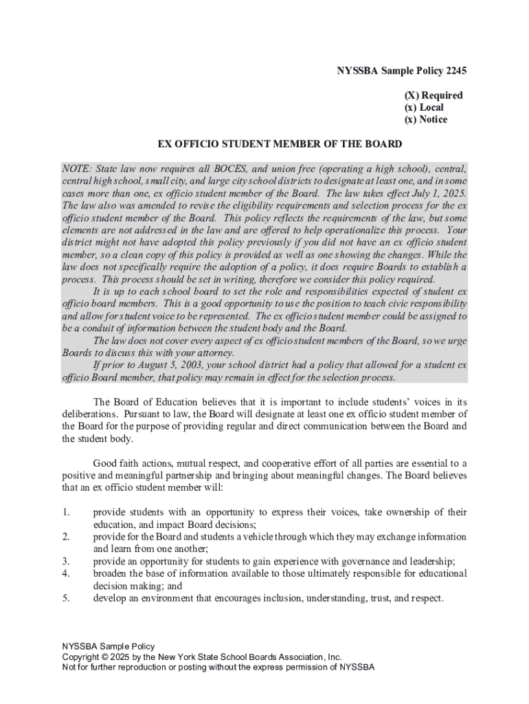 Accessing the NYSSBA Sample Policy 2245 Form is straightforward. The form can be found on official local education authority websites or directly through the New York State School Boards Association (NYSSBA) website. For convenient access, the form is often available in various formats such as PDF, which can be filled out digitally.