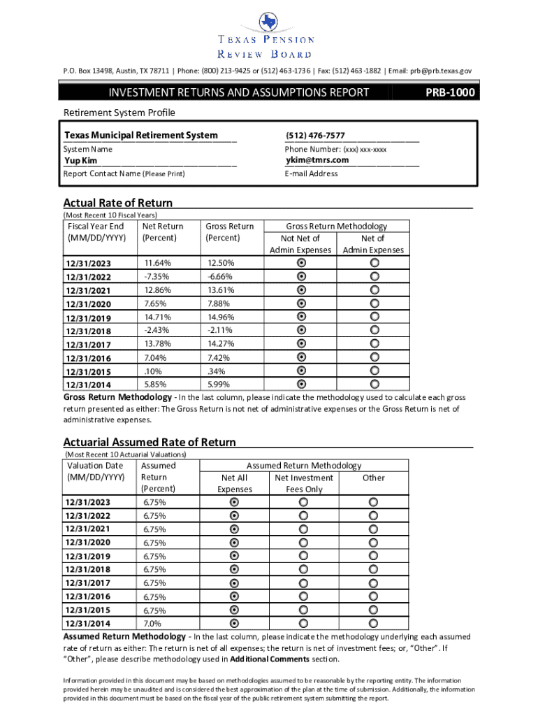 Este informe proporciona datos sobre los retornos de inversin y suposiciones del Sistema de Jubilacin Municipal de Texas para los ltimos 10 aos fiscales y valoraciones actuariales.