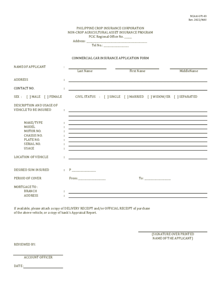 This document is a Commercial Car Insurance Application Form intended for applicants of the Philippine Crop Insurance Corporation\'s NonCrop Agricultural Asset Insurance Program.