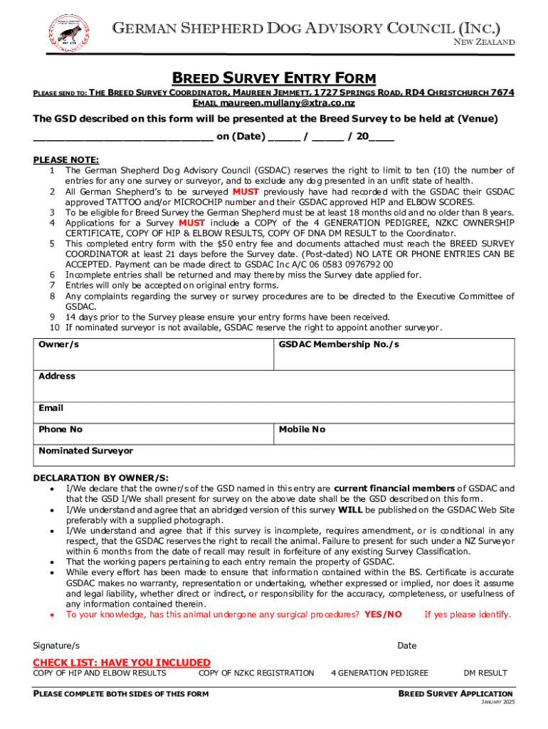 Get the free Breed Survey Entry Form - nzgsdac org