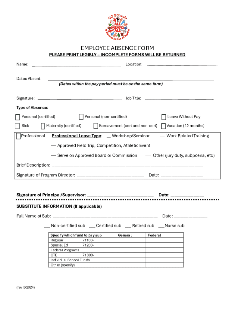 An employee absence form is a document used by employees to formally notify their employer about their absence from work due to illness, personal reasons, or other circumstances.