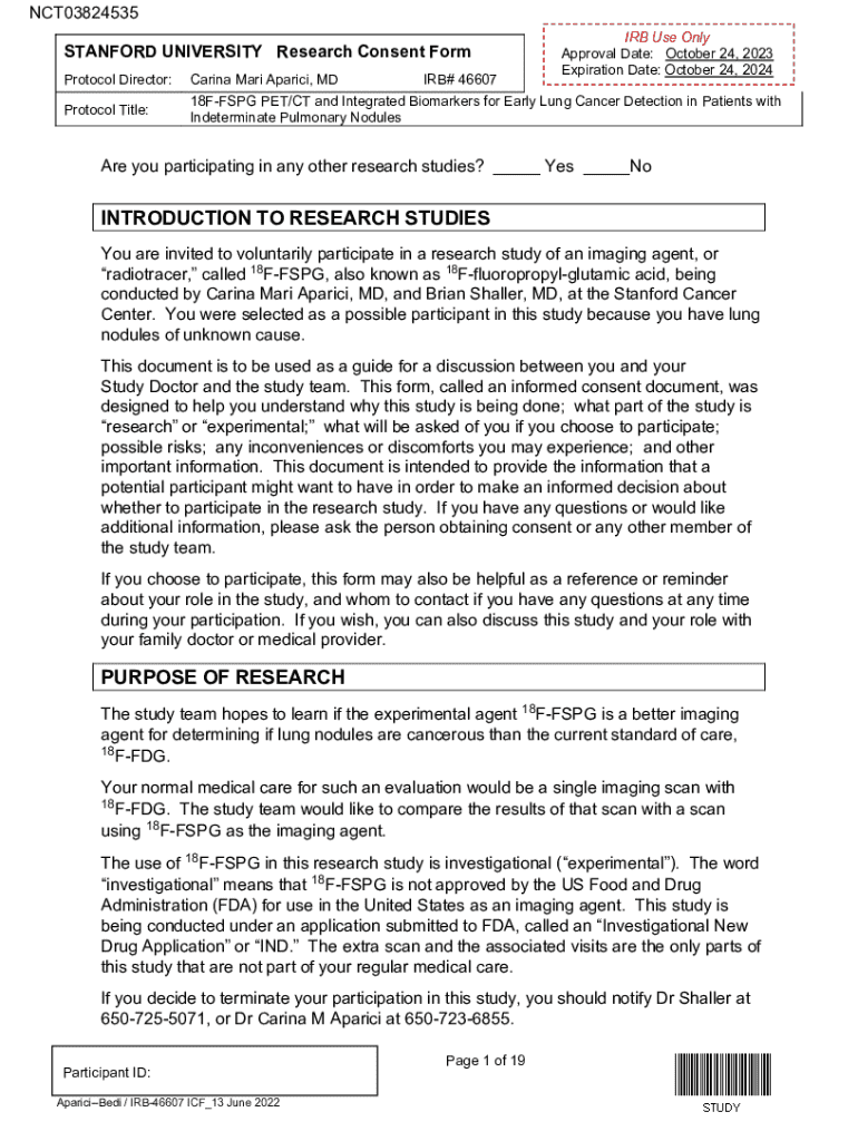 This document serves as an informed consent form for a research study assessing the imaging agent 18FFSPG for early lung cancer detection in patients with indeterminate pulmonary nodules. It outlines