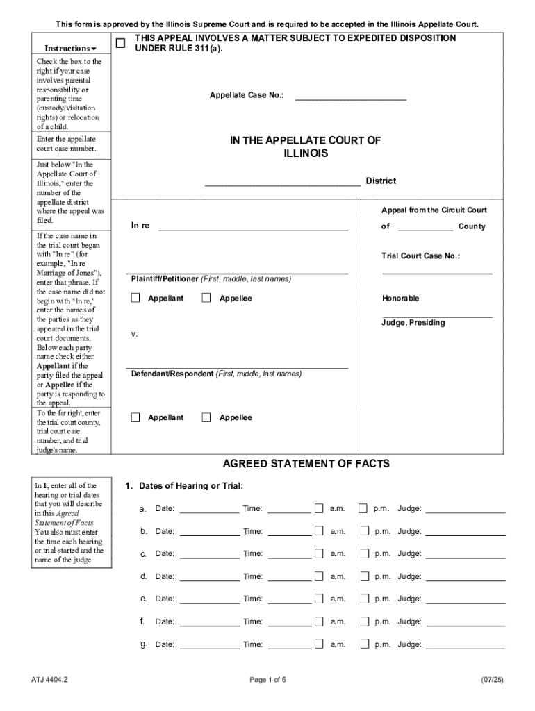 This document is used in the Illinois Appellate Court for agreeing on facts to be presented in an appeal, including details of hearings, parties involved, and method of document delivery.