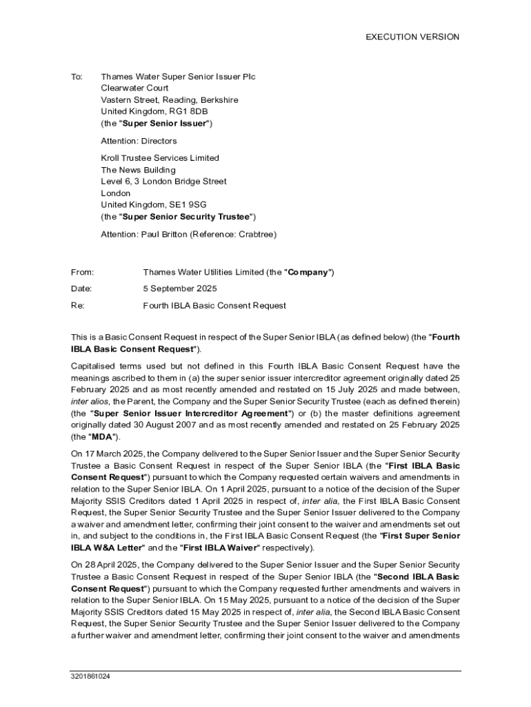 This document serves as a Basic Consent Request concerning the Super Senior IBLA, detailing previous consent requests, background information on penalties from Ofwat, and outlining a proposed Payment