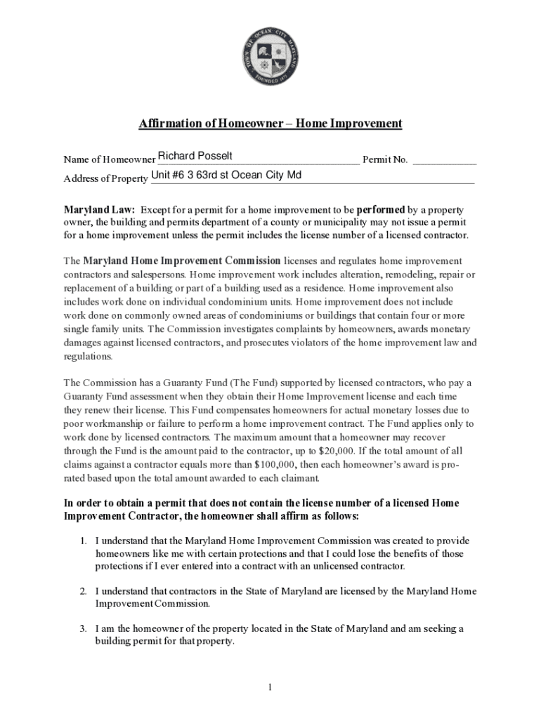 Filling out the homeowner's affirmation form requires careful attention to detail. Start by entering your personal information, including your full name, address, and contact details. This ensures that the form accurately represents you as the homeowner and that your contact information is up-to-date, which is critical for future communications regarding the property.