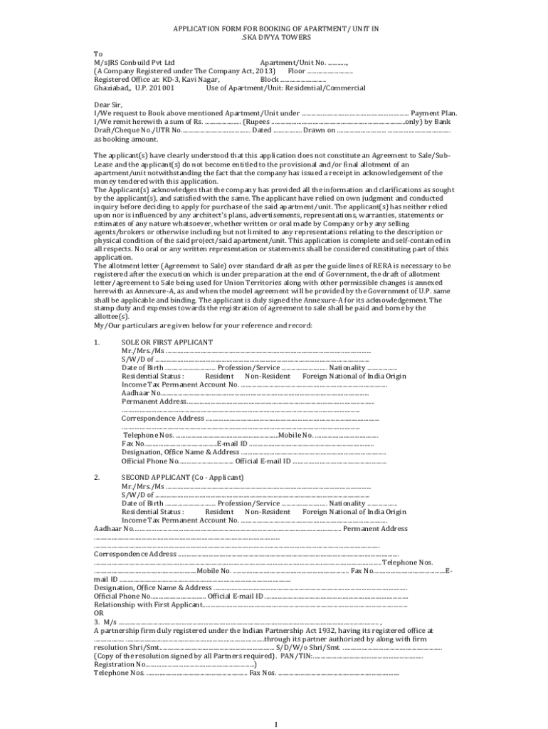 Get the free Application Form for Booking of Apartment/ Unit in Ska Divya Towers