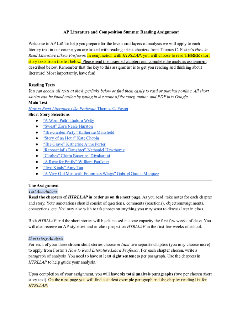 Get the free Ap Literature and Composition Summer Reading Assignment