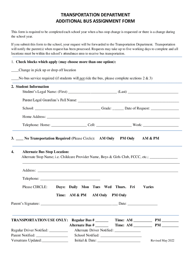 Understanding who can request an additional bus assignment is essential. Generally, any parent or legal guardian of a student can initiate this request, ensuring their child has the required transportation services tailored to their needs. Schools often set guidelines regarding the age and grade of students eligible for these modifications, usually focusing on elementary and middle school children.