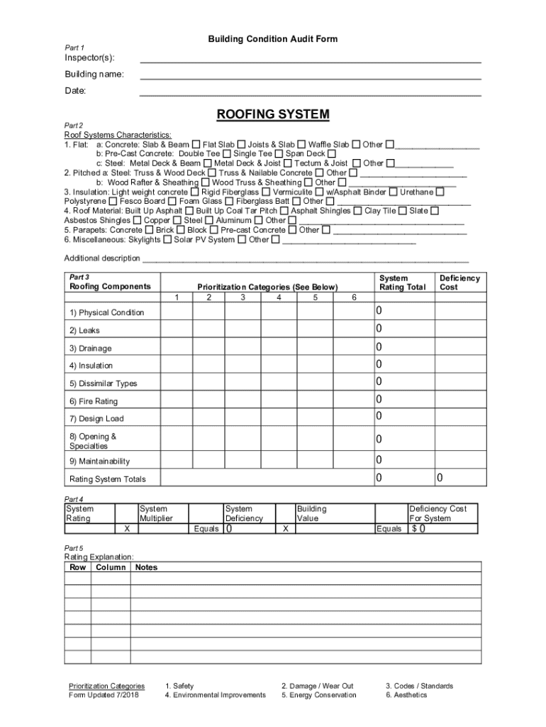 A well-structured building condition audit form encompasses various sections, each designed to facilitate comprehensive evaluations. The form generally includes sections for exterior inspection, interior inspection, mechanical systems evaluation, and safety and compliance checks. Each section is crucial for obtaining a holistic view of the property's health.