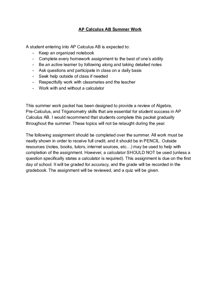 Obtain the AP Calculus AB Summer assignment from your teacher or school website.