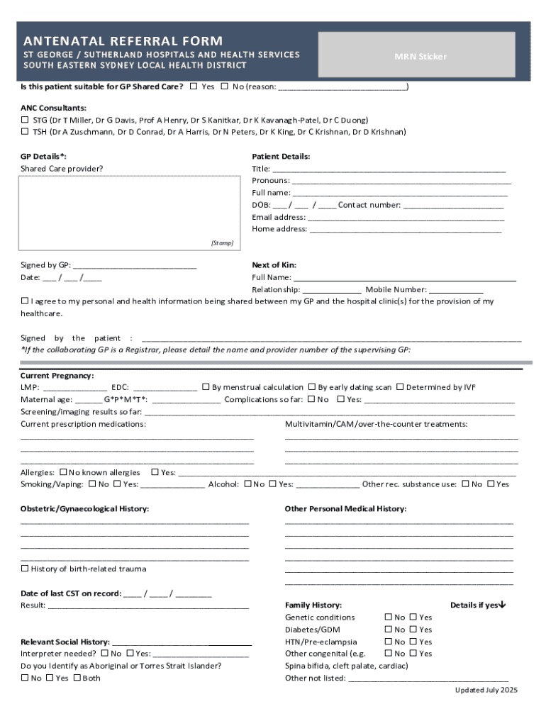When filling out the antenatal referral form, several key sections require your attention for accurate and complete submission. First, the patient details section includes your personal identification information, which is crucial for establishing your healthcare records.