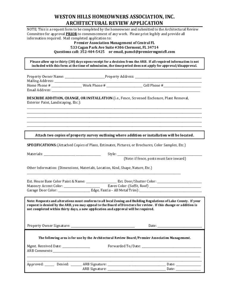 Providing clear instructions for completing the architectural review application form is essential. Homeowners should start by referencing their governing documents, which outline specific guidelines and restrictions related to property modifications. Understanding these requirements will facilitate compliance and enhance the chances of approval.