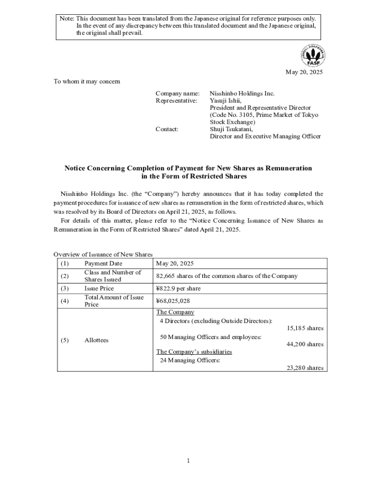 Get the free Notice Concerning Completion of Payment for New Shares as Remuneration in the Form o...