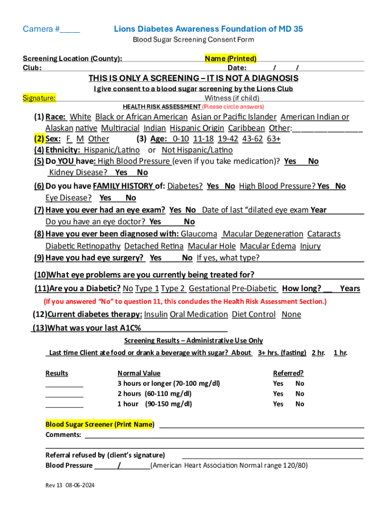 Before filling out a blood sugar screening consent form, it is essential to prepare adequately. Start by gathering necessary personal identification details such as your name, address, and medical identification number. Be ready to disclose any relevant medical history, particularly conditions like diabetes or metabolic syndrome, as this information can inform your healthcare provider's approach to your screening.