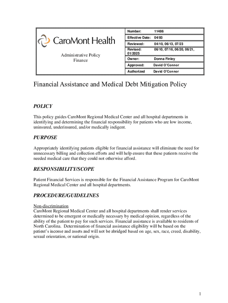 Get the free Financial Assistance and Medical Debt Mitigation Policy