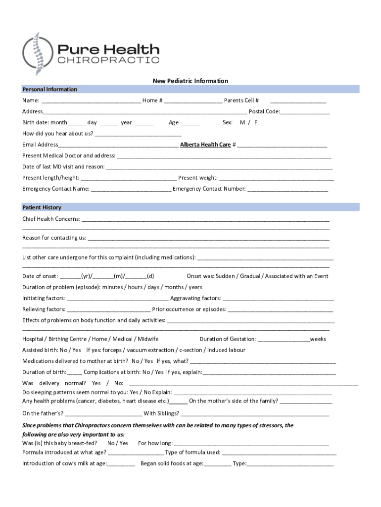 This document is a comprehensive form for collecting detailed pediatric patient information, including personal and medical history, for chiropractic care.