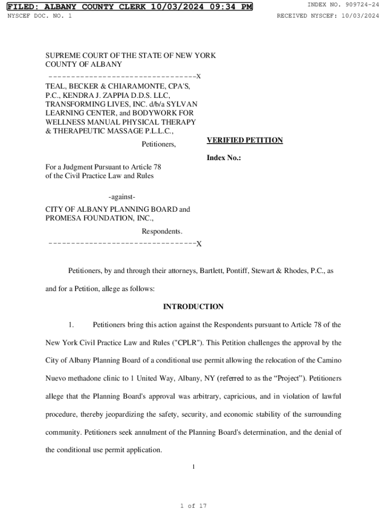 This document is a verified petition by multiple petitioners challenging the City of Albany Planning Board\'s approval of a conditional use permit for the relocation of the Camino Nuevo clinic, citing