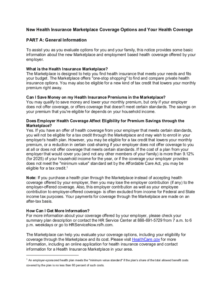 This notice provides basic information about the new Marketplace and employeroffered health coverage, including eligibility, cost savings, and employer responsibilities.