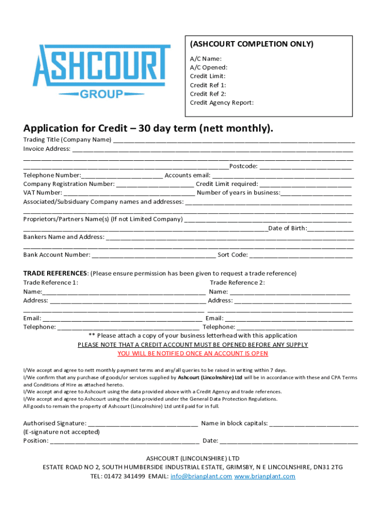 Este documento es una solicitud de crdito para una cuenta con Ashcourt (Lincolnshire) Ltd, que incluye detalles necesarios para evaluar la solicitud de crdito.