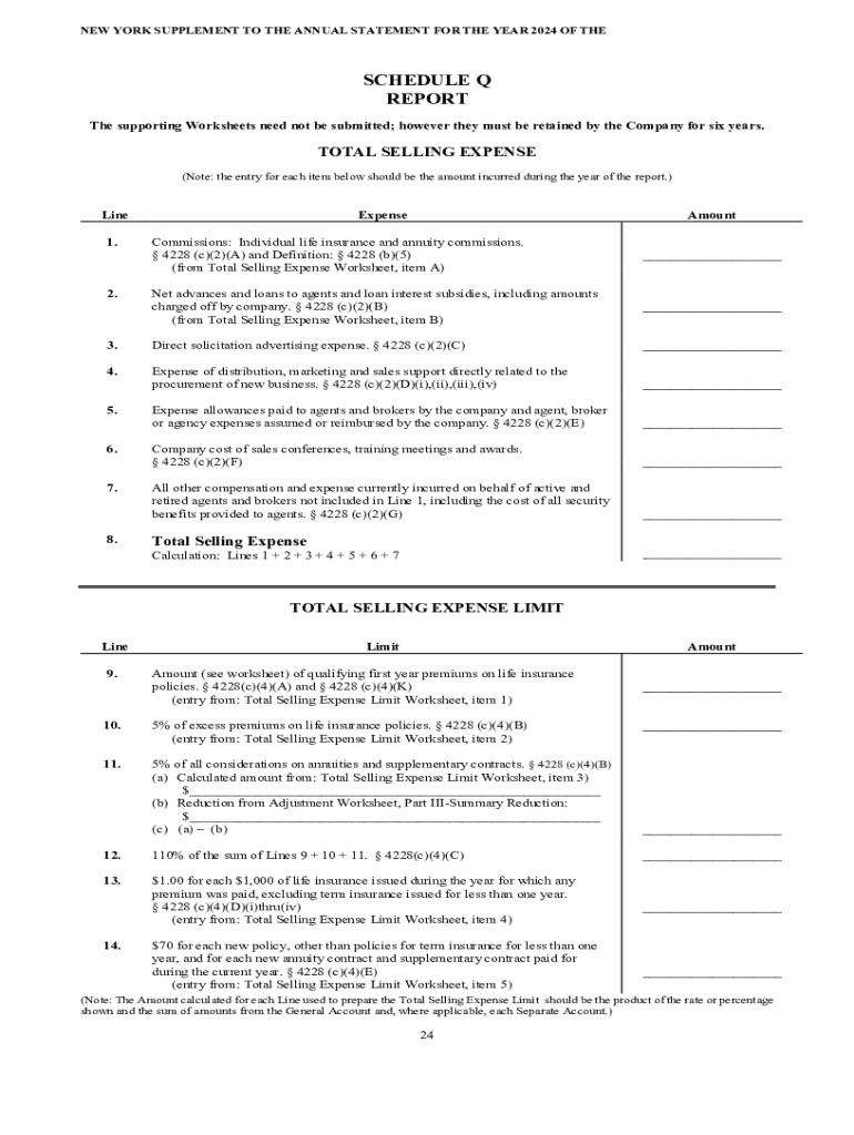 Get the free New York Supplement to the Annual Statement for the Year 2024 of the Schedule Q