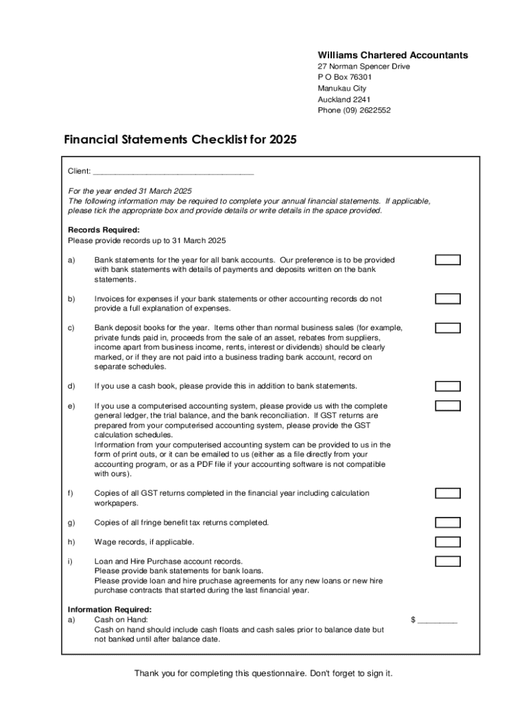 A well-structured financial statements checklist includes vital information for each statement type. Understanding this information is crucial for anyone involved in financial reporting, whether you are an accountant, a business owner, or a financial analyst. Each financial statement has unique requirements that must be addressed systematically.