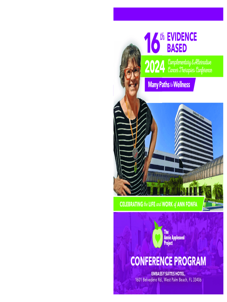 This document provides information about the 16th Annual Complementary & Alternative Cancer Therapies Conference, including program details, speakers, agendas, and the mission of the Annie Appleseed