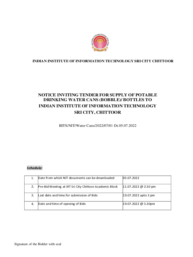Get the free notice inviting tender for supply of potable - IIIT Sri City - iiits ac