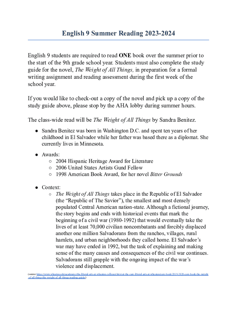 Get the free English 9 Summer Reading 2023-2024