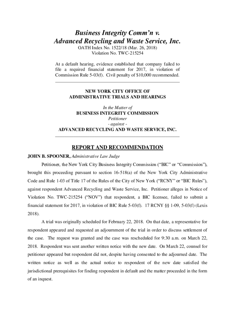 Get the free Business Integrity Comm’n V. Advanced Recycling and Waste Service, Inc. - archive ci...