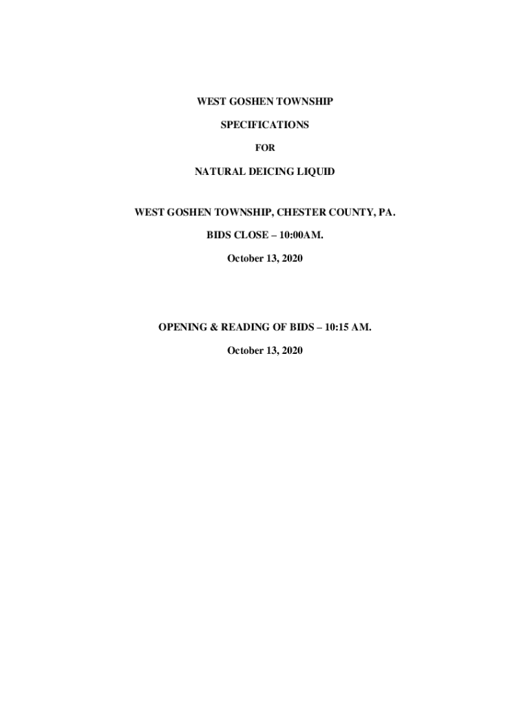 This document outlines the bidding process and specifications for the procurement of natural deicing liquid by West Goshen Township, including requirements, terms, and conditions for bidders.