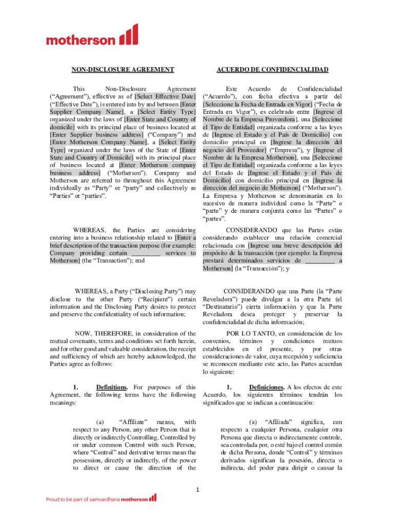 Un non-disclosure form, o acuerdo de confidencialidad (NDA por sus siglas en inglés), es un documento legalmente vinculante que establece las condiciones bajo las cuales una o ambas partes acuerdan no divulgar información confidencial. Generalmente, se utiliza cuando hay un intercambio de información sensible entre empresas, colegas o al negociar un proyecto. El propósito de un NDA es proteger la información del divulgador y garantizar que esta no se use de manera inapropiada o se comparta sin consentimiento.