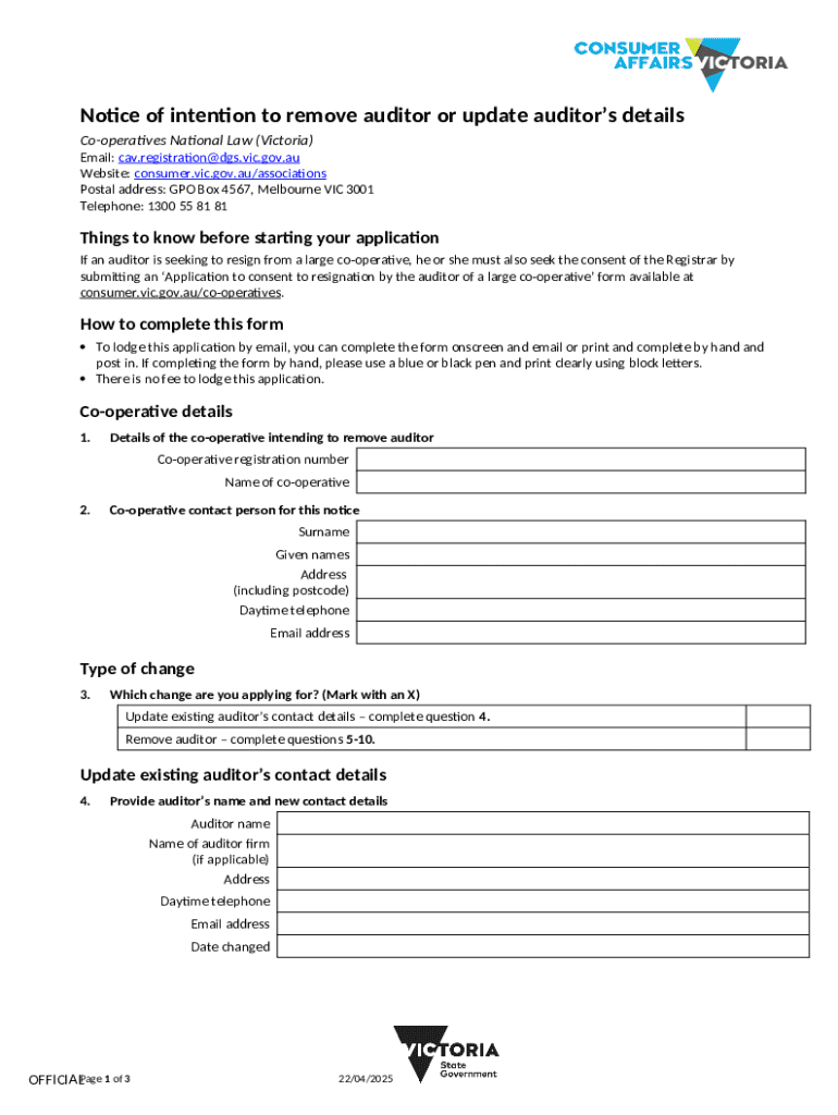 Instructions for the form Notice of Intention to Remove Auditor or Update Auditor’s Details